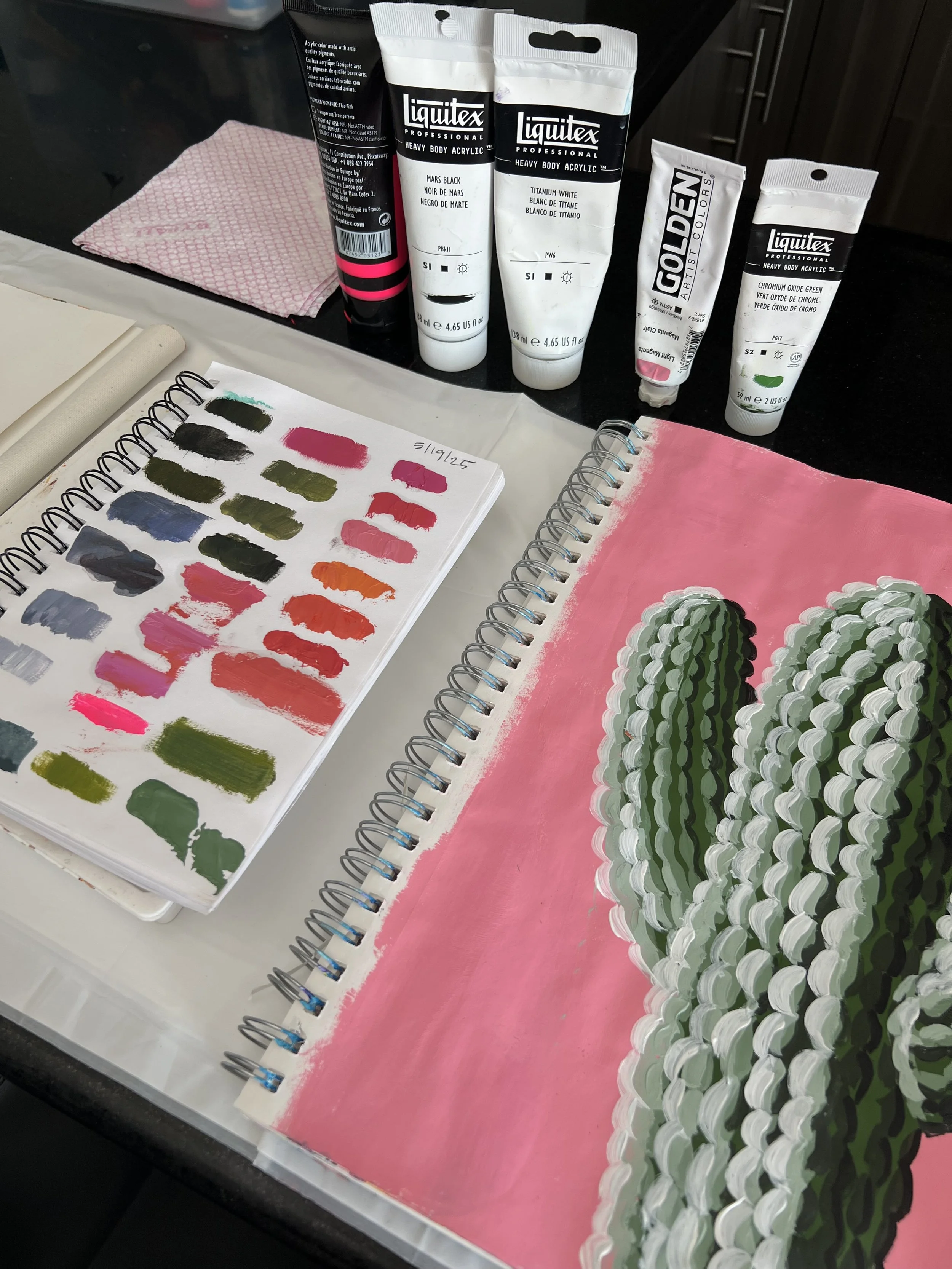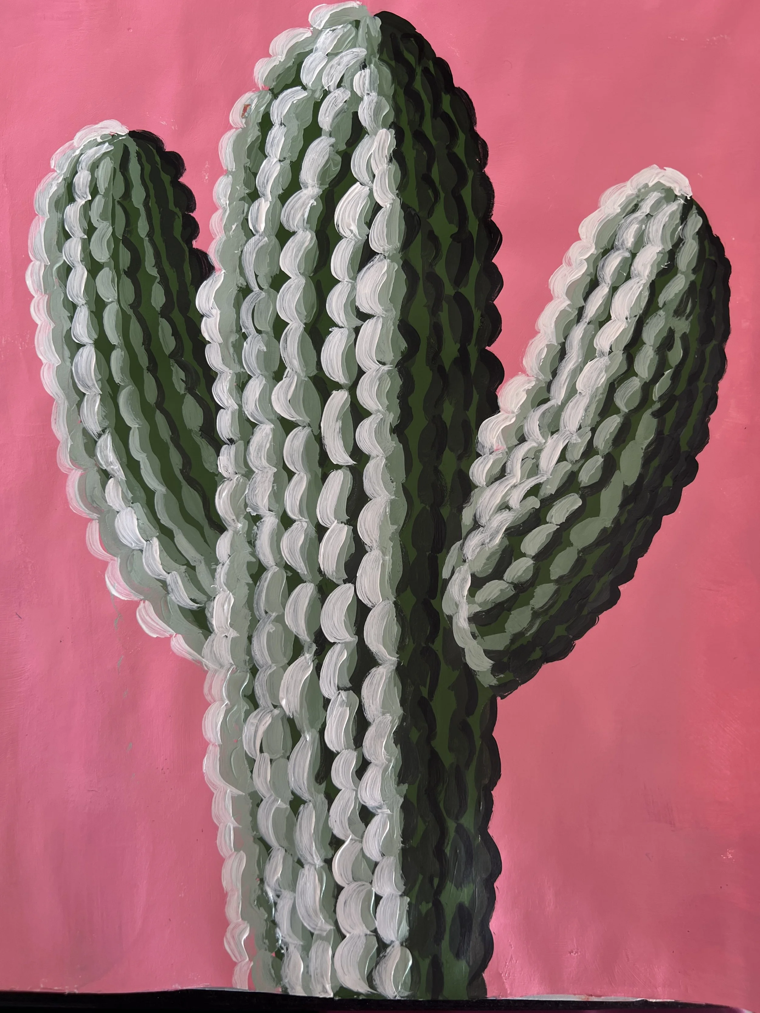 There are beautiful, exotic looking cacti everywhere in my neighborhood where I walk my dog Maple twice a day. I am always stunned by how different they look from each other and each one begins sprouting blooms and appendages when heavy rains roll through. I think they are quintessentially Mexican although they grow in my native California along with Arizona, New Mexican and Texas as well. While this painting on paper came out a little cartoonish which isn’t a bad thing, it is an attempt at capturing how light varies on just one cactus and how the details make it look otherworldly.